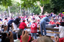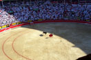 We asked around and found some locals at a T-shirt stand that sold tickets. We got the tickets and were all ready for the fight at 18:30 that evening. We were pumped because we not only ran with the bulls, but we were also going to a bullfight. At 18:00 we went to the bullring and headed inside. Of course we had the cheap seats so we went up all the stairs to the top. Once we found our section we figured out that the seating was like student seating at Georgia Tech football games. As long as you're in your section, it's first come first serve. Well, we didn't like the fact that we had to sit on the 5th to last row, but soon we were glad that we were sitting there. Right before the fight some people headed up the stairs across the section from us. They apparently obstructed someone's view so some of the other spectators threw their alcohol at them. They got soaked with this red alcohol. It was strange. Come to find out that this is very normal for Pamplona bullfights. If you rub someone the wrong way by sitting or standing in the wrong place, you get drenched with alcohol or hit with lemon rinds. What ever they can find they throw. This is why we were glad about sitting so high up. After they are drunk they don't have good aim, and everyone below them gets hit.
