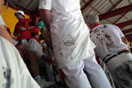 Then the bullfight begins. Some may not like the idea of bullfights, so I will not right about specifics. Nor did I post any pictures that might be offensive in nature. I will just say that it is more like an art form than a sport. Halfway through the fight everyone pulls out their dinner and starts to eat. Whatever they had they tried to offer to those sitting around their area. It was wonderful. We found out that our section was where the fish market guys sat. They had ink from squid that they made sandwiches out of. I didn't have one, but they did rub the ink all over the people around them. It was a mess. Check out the picture of those guys' backs! In the end we leave and prepare for a night out. The streets are just nasty the whole time we have been in Pamplona. Jeremy and I decide to get some sleep in the park Saturday night, while the other two stayed up all night. The next morning Jeremy and I get ready for the run. He was going to run again and I wanted to take pictures. I head to the end of the course to setup for a place to stand. It is 6:00 when I get there and all of the good places are taken, but I do find a place by a tree that is slightly raised. I get ready to wait 2 hours.